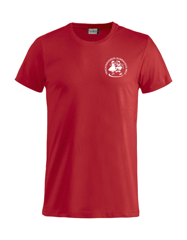 T-Shirt, körpernah geschnitten, Nackenband und Kragen sind mit Elasthan versetzt, verstärkte Schulternähte. Herren ist rund gestrickt und Damen hat Seitennähte. Waschbar bis 60° C.